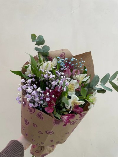 Букет из разноцветной альстромерии, гипсофилы и эвкалипта