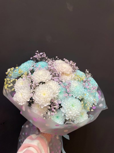 Букет из хризантемы и разноцветной гисофилы