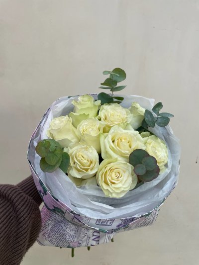Букет из белый роз "Мондиаль" с эвкалиптом
