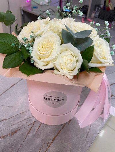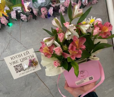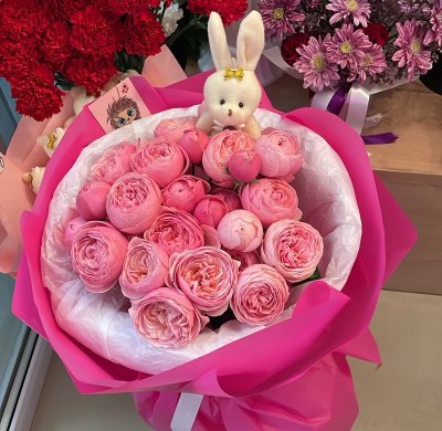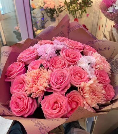 Букет из кустовой хризантемы, розы Пинк Флойд, кустовой розы Одилия и эвкалипта