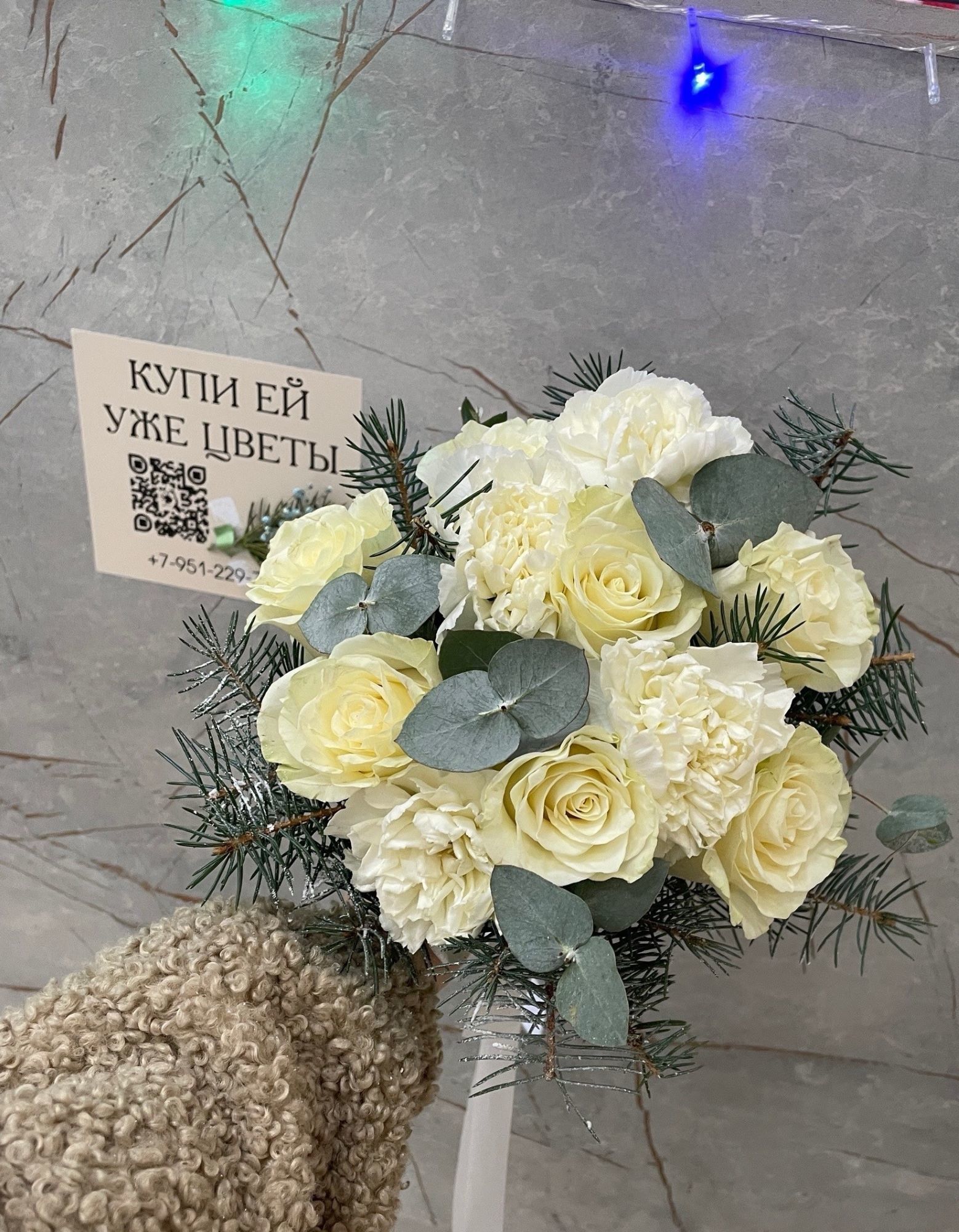 Свадебный букет из диантуса, белой розы, эвкалипта и хвои