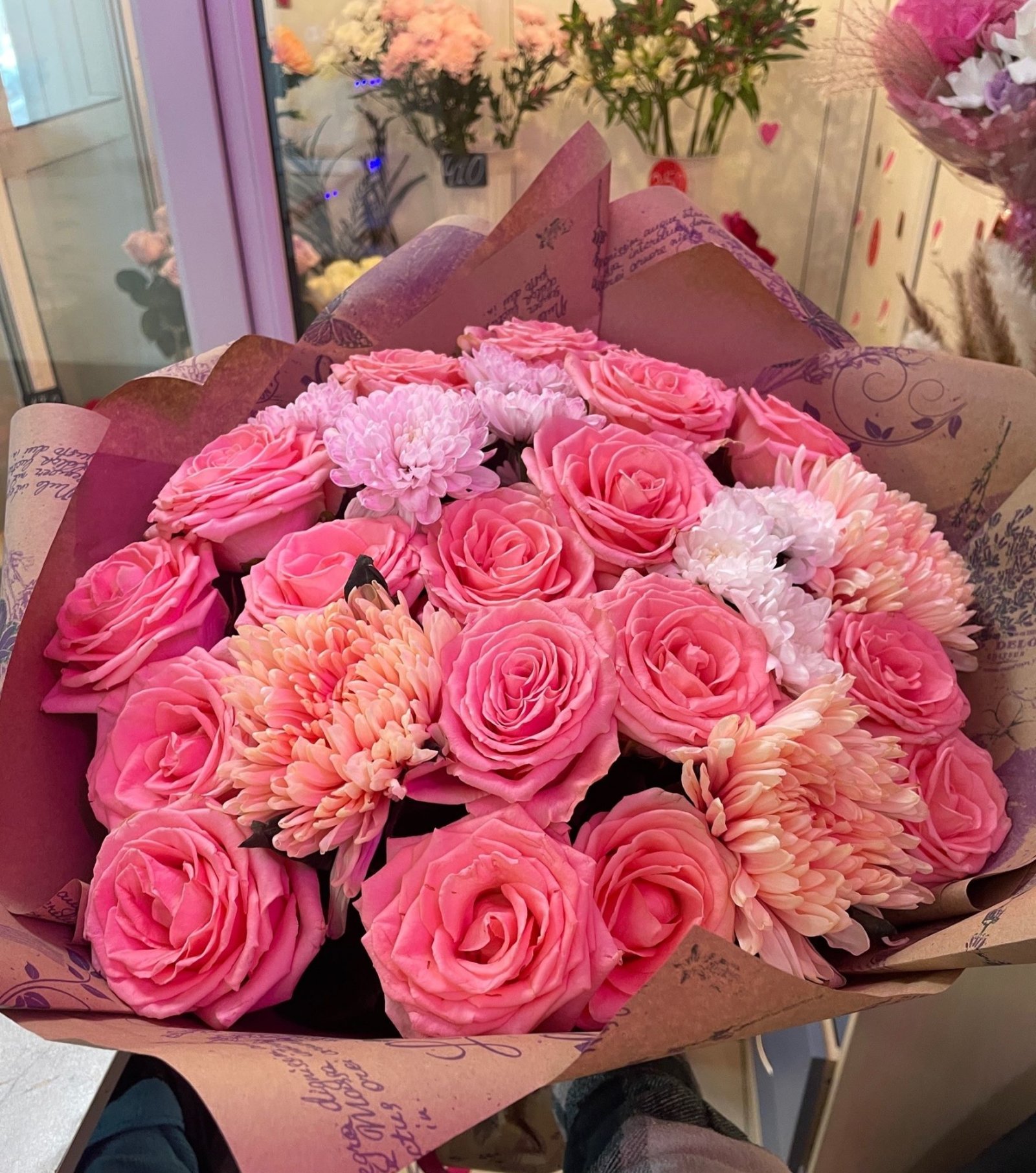 Букет из роз Софи Лорен и одноголовой хризантемы